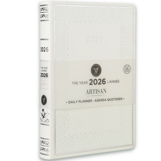 2026 Artisan Daily Planner — White Vegan Leather Vintage Style (5.7" × 8.1", Bilingual, One-Day-Per-Page)