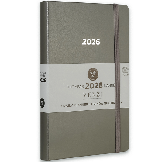2026 Venzi Daily Planner — Grey Vegan Leather with Elastic (5.1" × 8.3", Bilingual, One-Day-Per-Page)