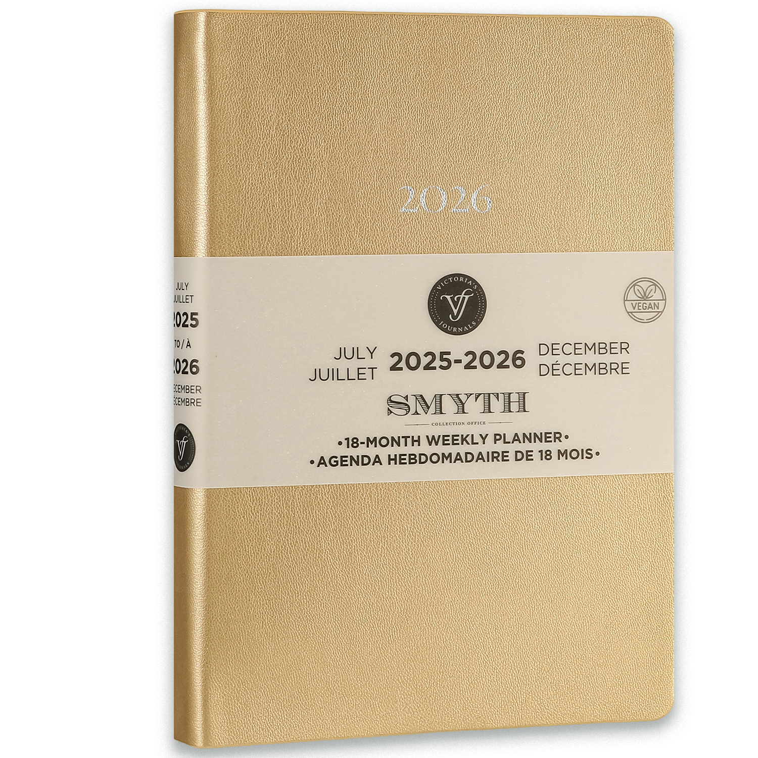 Elegant. Luxurious. Timeless. The Victoria’s Journals Smyth Academic Weekly Planner in Gold is designed for those who want planning to feel as refined as their lifestyle. Spanning July 2025 through December 2026, this A5 planner combines practical weekly and monthly layouts with a shimmering gold vegan leather hard cover.