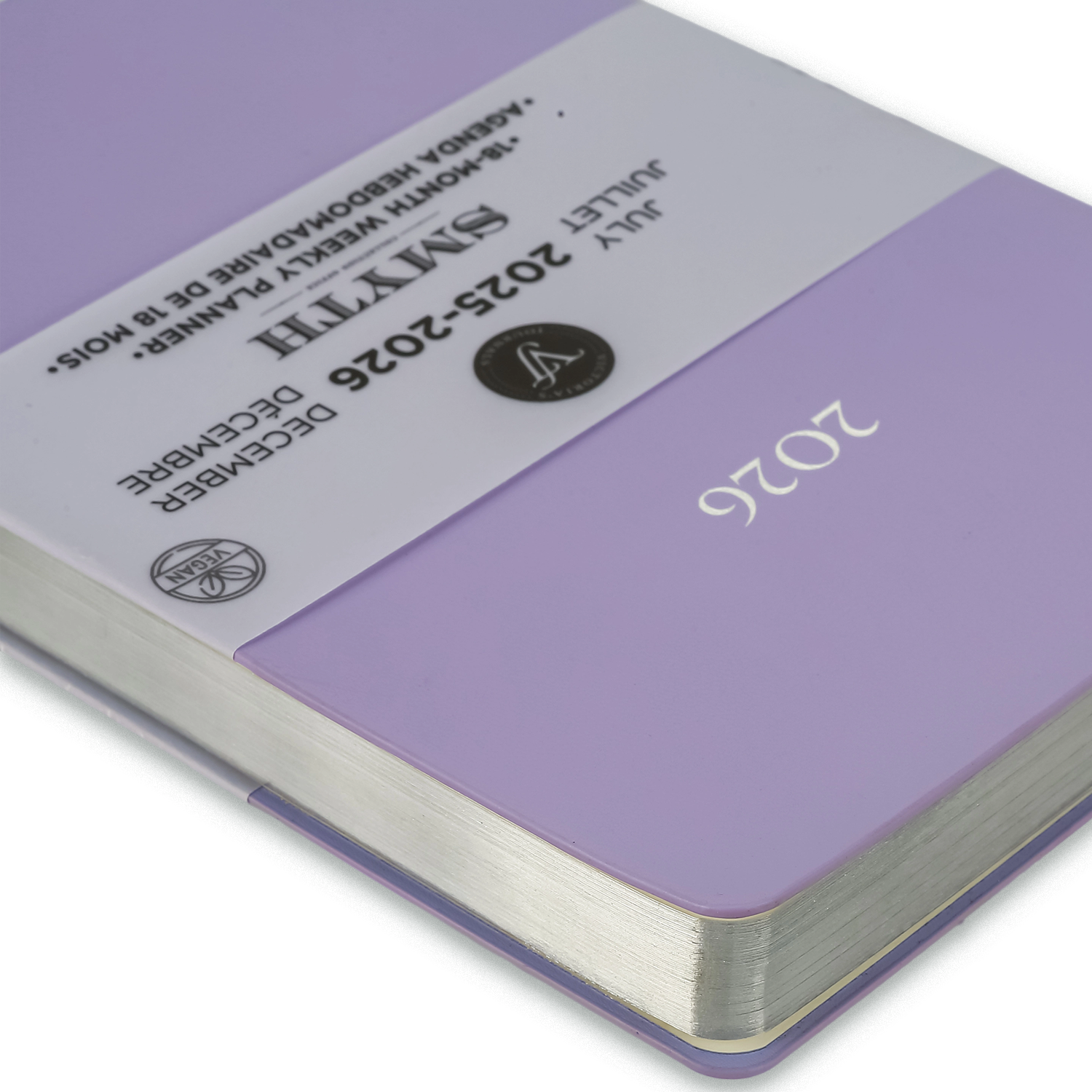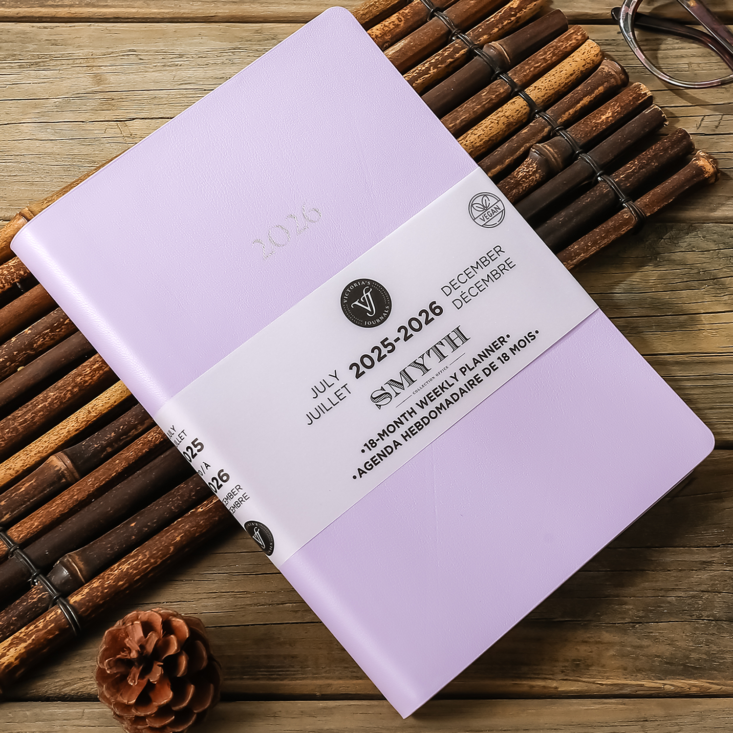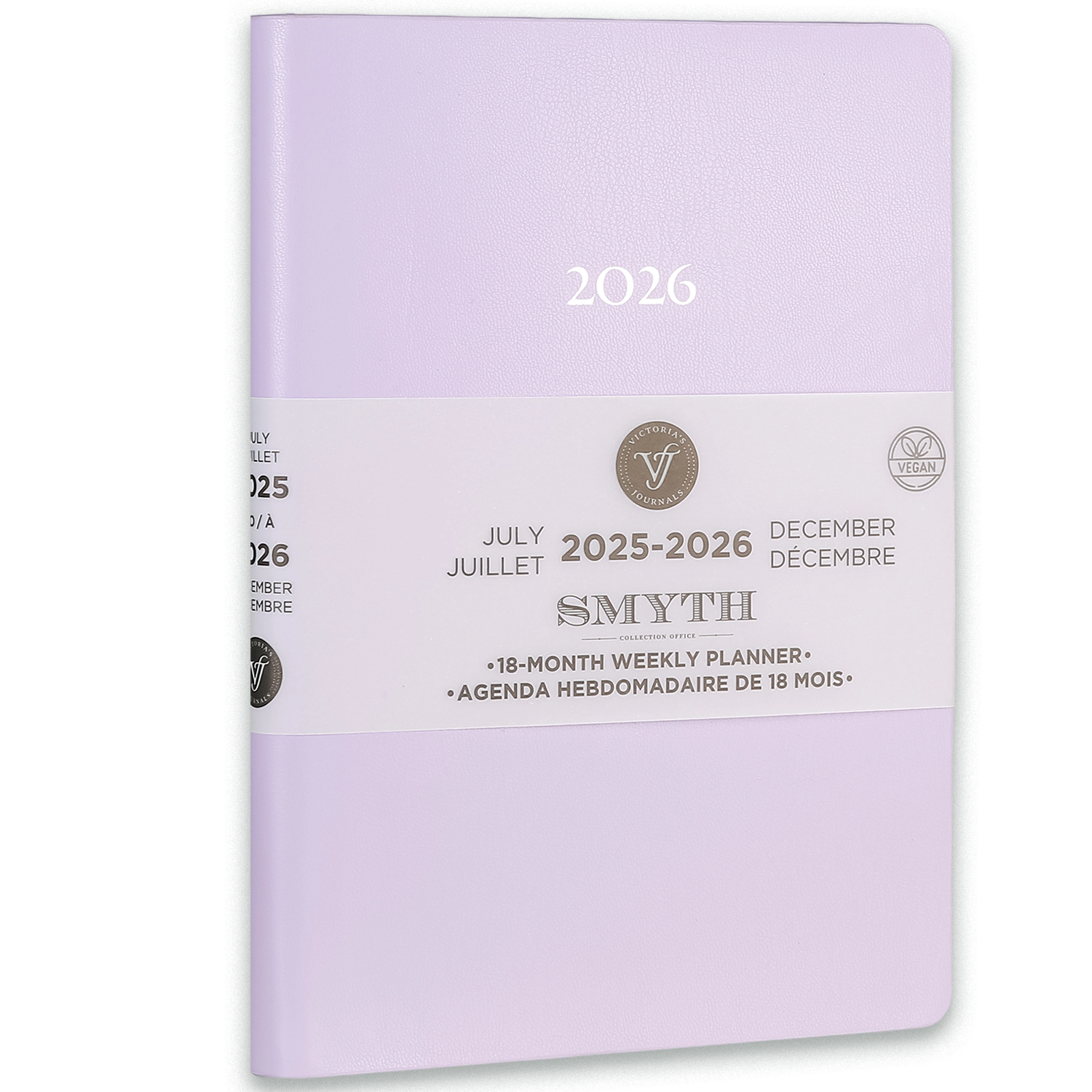 The Victoria’s Journals Smyth Academic Weekly Planner in Lavender is designed to guide you from July 2025 through December 2026 with elegance and ease. Its soft lavender vegan leather cover pairs timeless sophistication with functional weekly layouts, making it ideal for students, teachers, and professionals.
