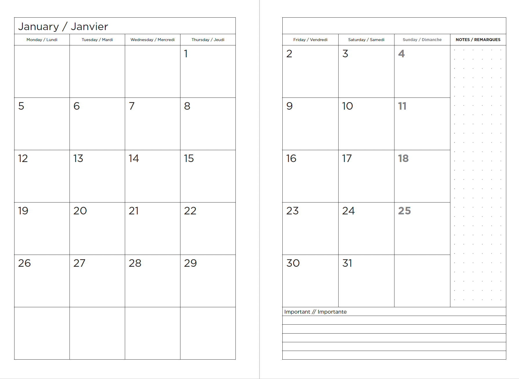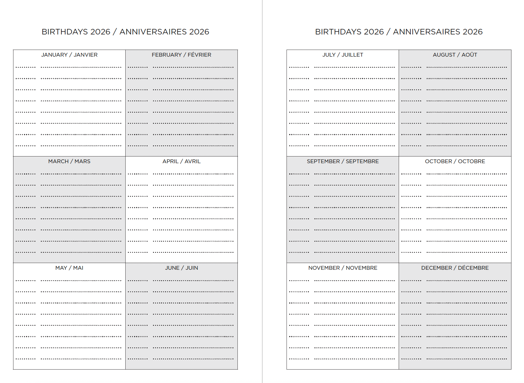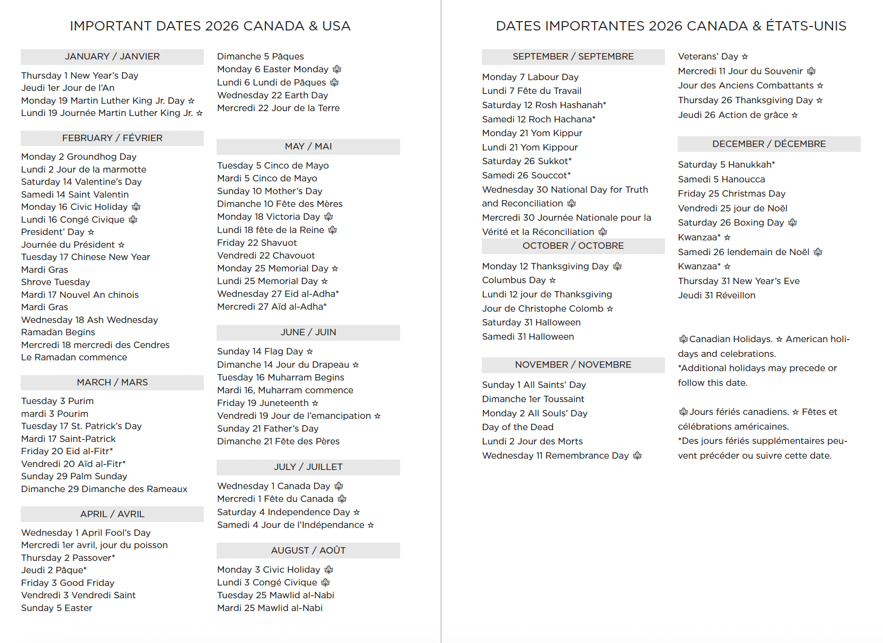 Smart extras: monthly overviews, year-end review section, and US & Canada holiday listings.