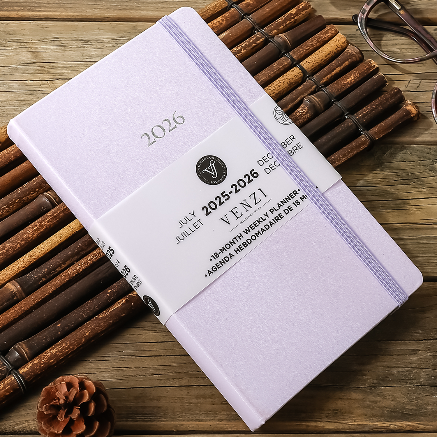 Plan beautifully for 18 months. The Victoria’s Journals 2025–2026 Weekly Planner blends a soft-touch lilac vegan leather hard cover with practical weekly spreads—perfect for appointments, tasks, notes, and reflections.