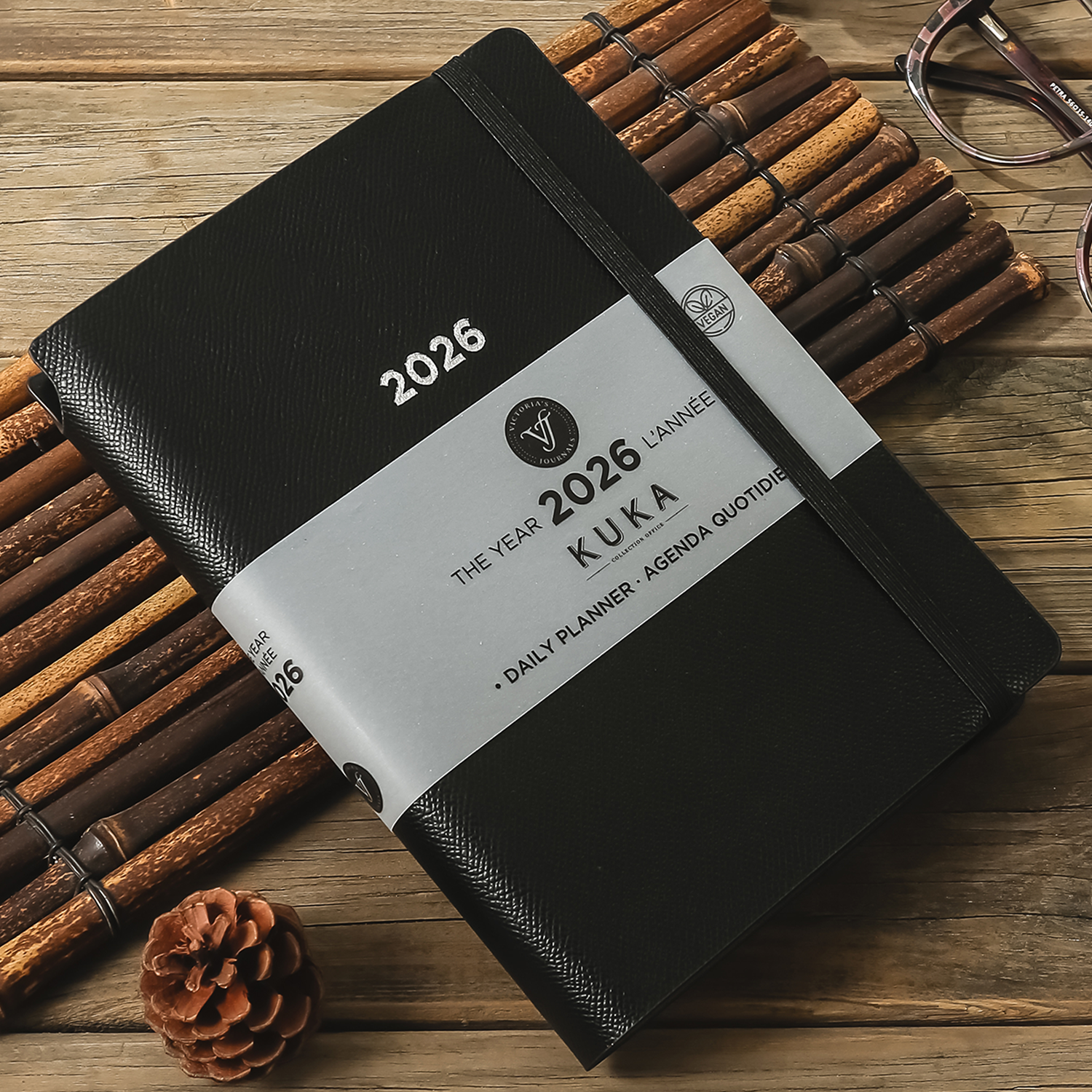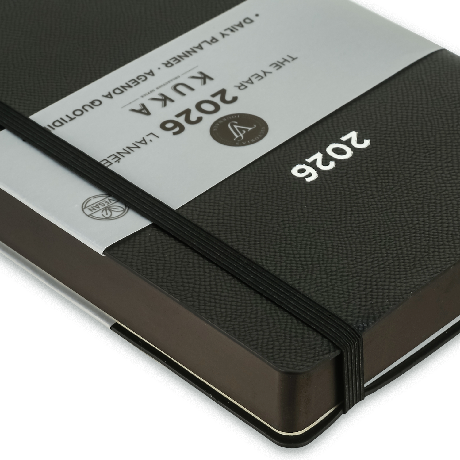 2026 Kuka Daily Planner — Black Vegan Leather with Pen Loop & Elastic (5.5" × 8", Bilingual, One-Day-Per-Page)