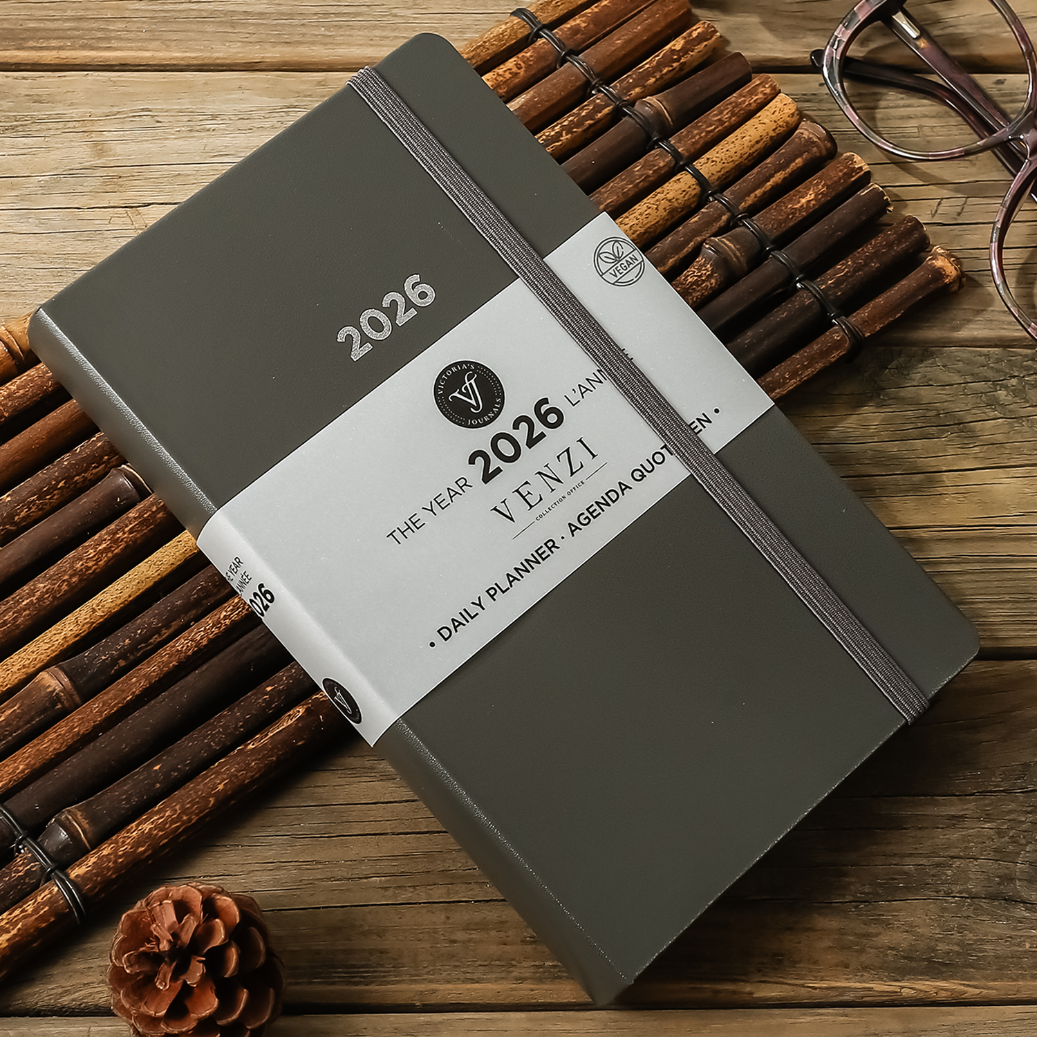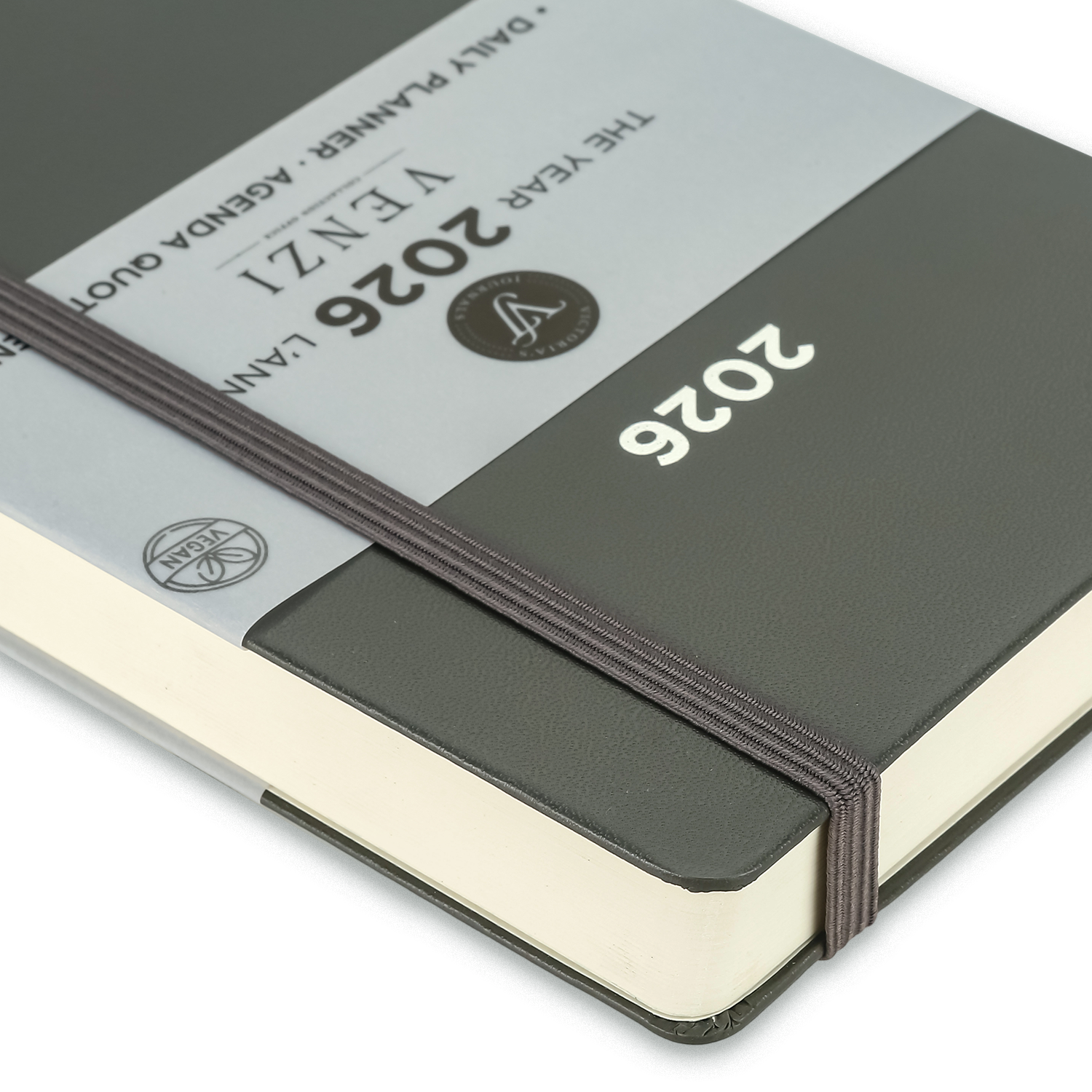 2026 Venzi Daily Planner — Grey Vegan Leather with Elastic (5.1" × 8.3", Bilingual, One-Day-Per-Page)