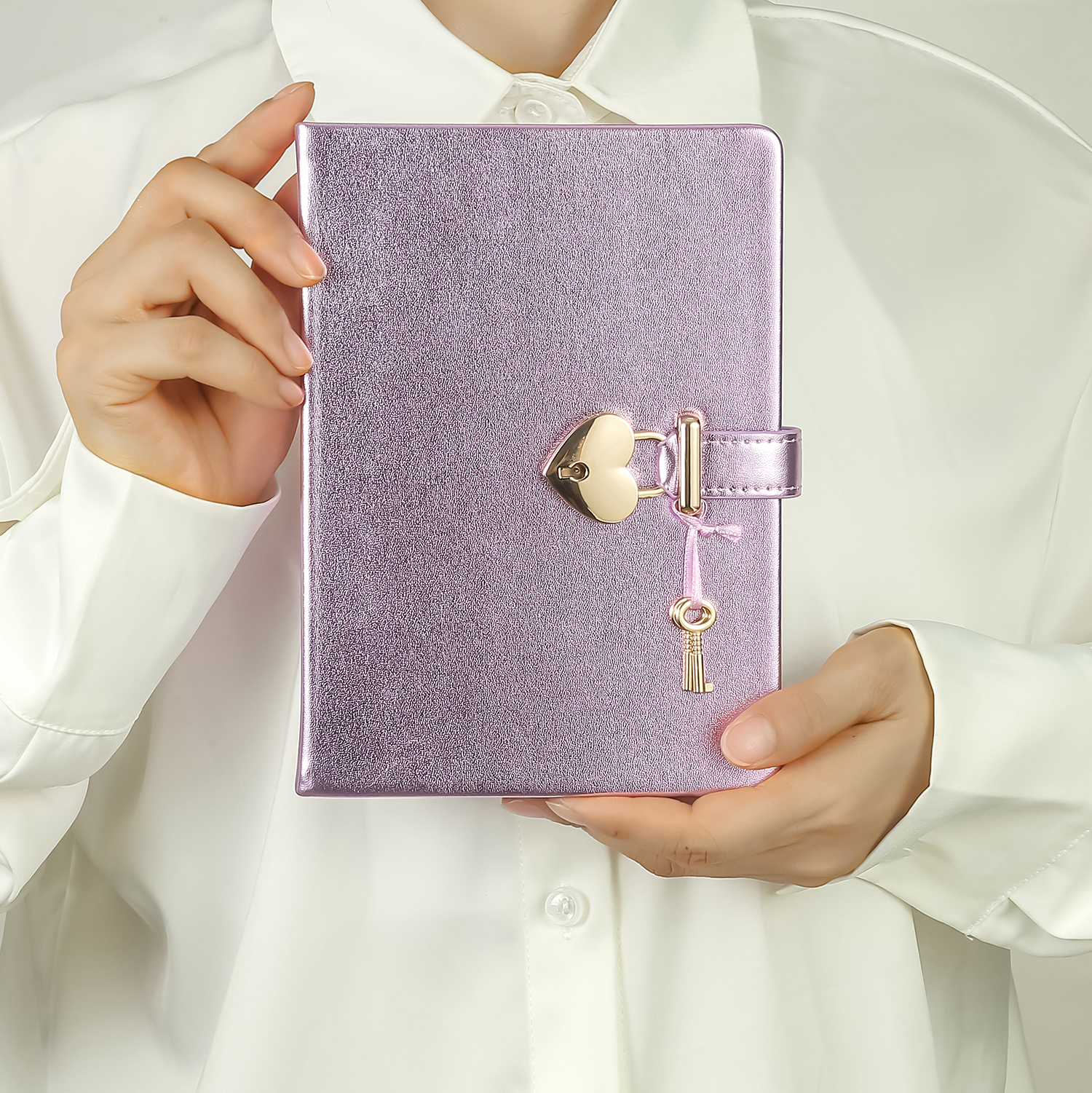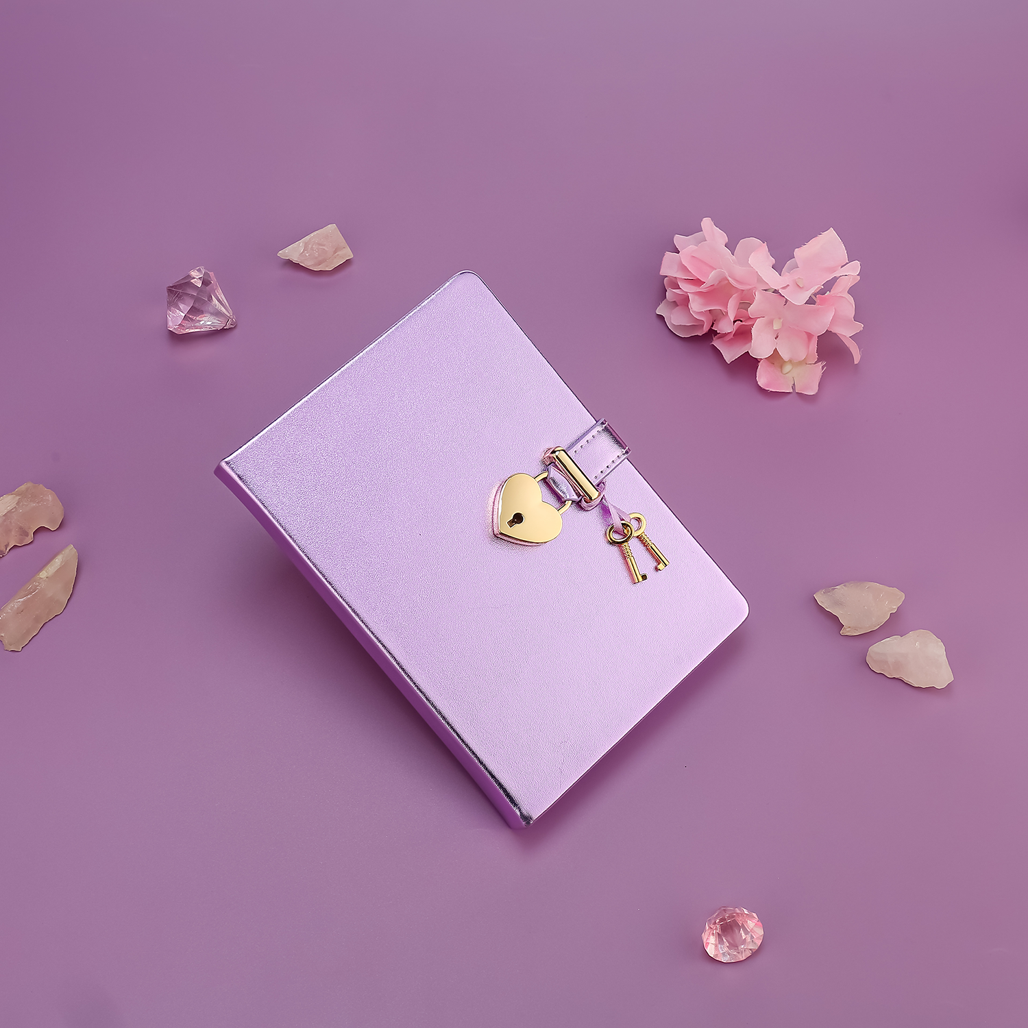 Cover: Iridescent purple vegan leather with durable heart-shaped lock & key