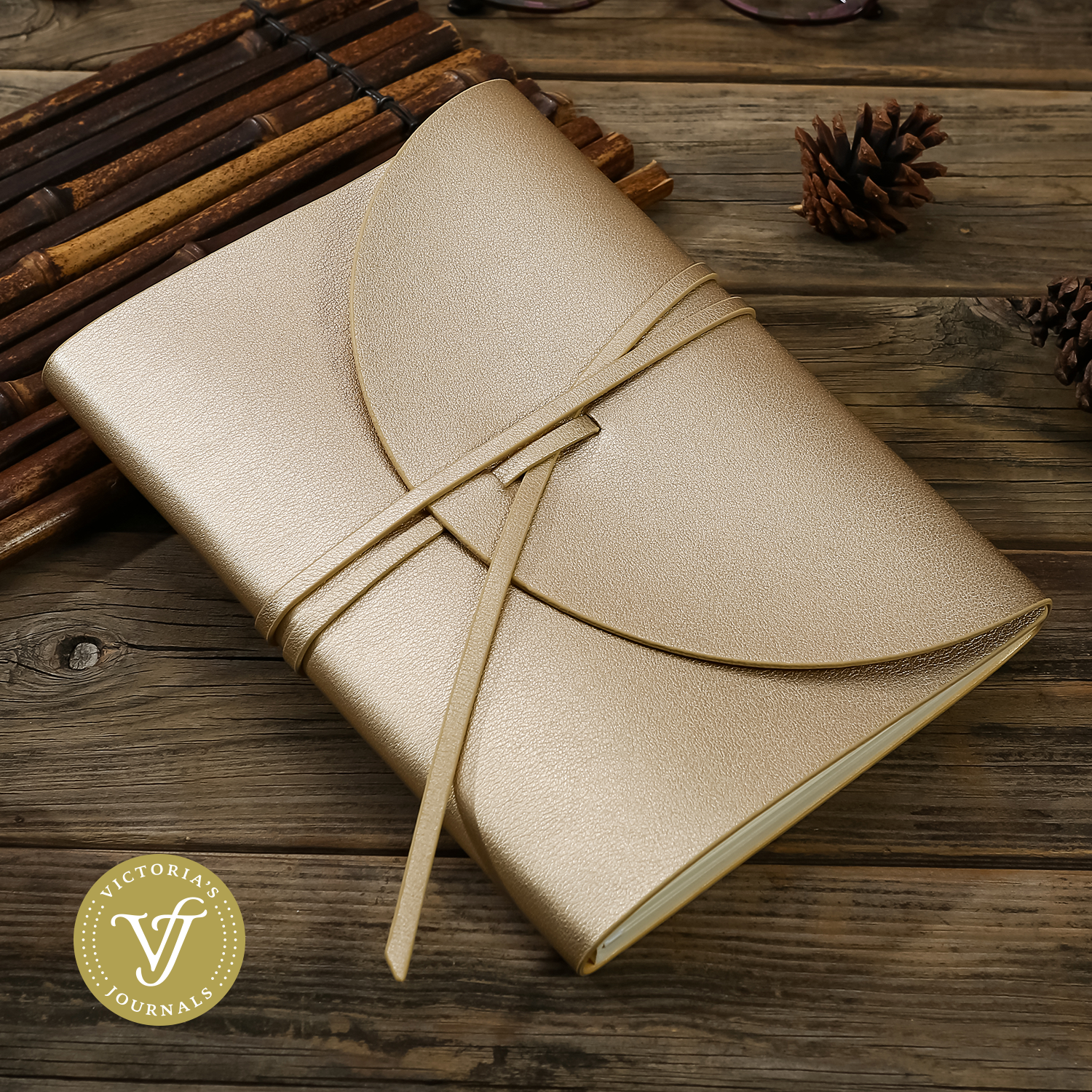 Cover: Champagne-gold (soft metallic beige) vegan leather with flexible binding