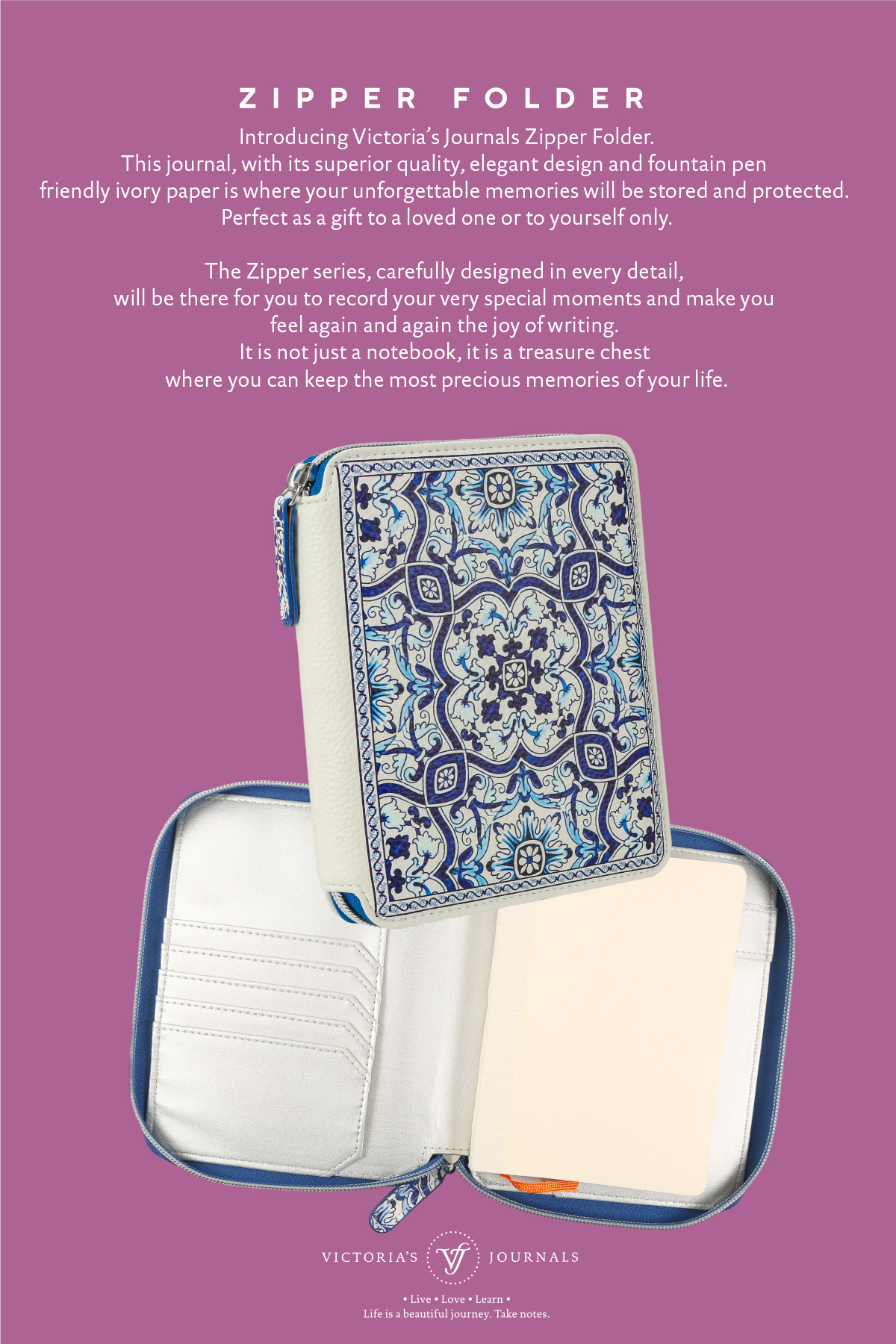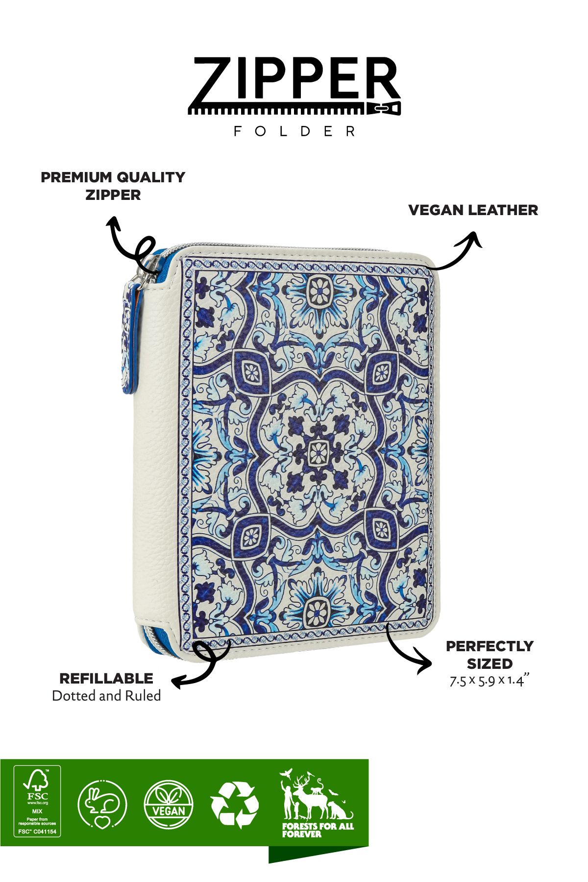 Zippered Vegan Leather Portfolio Diary (Azulejo)