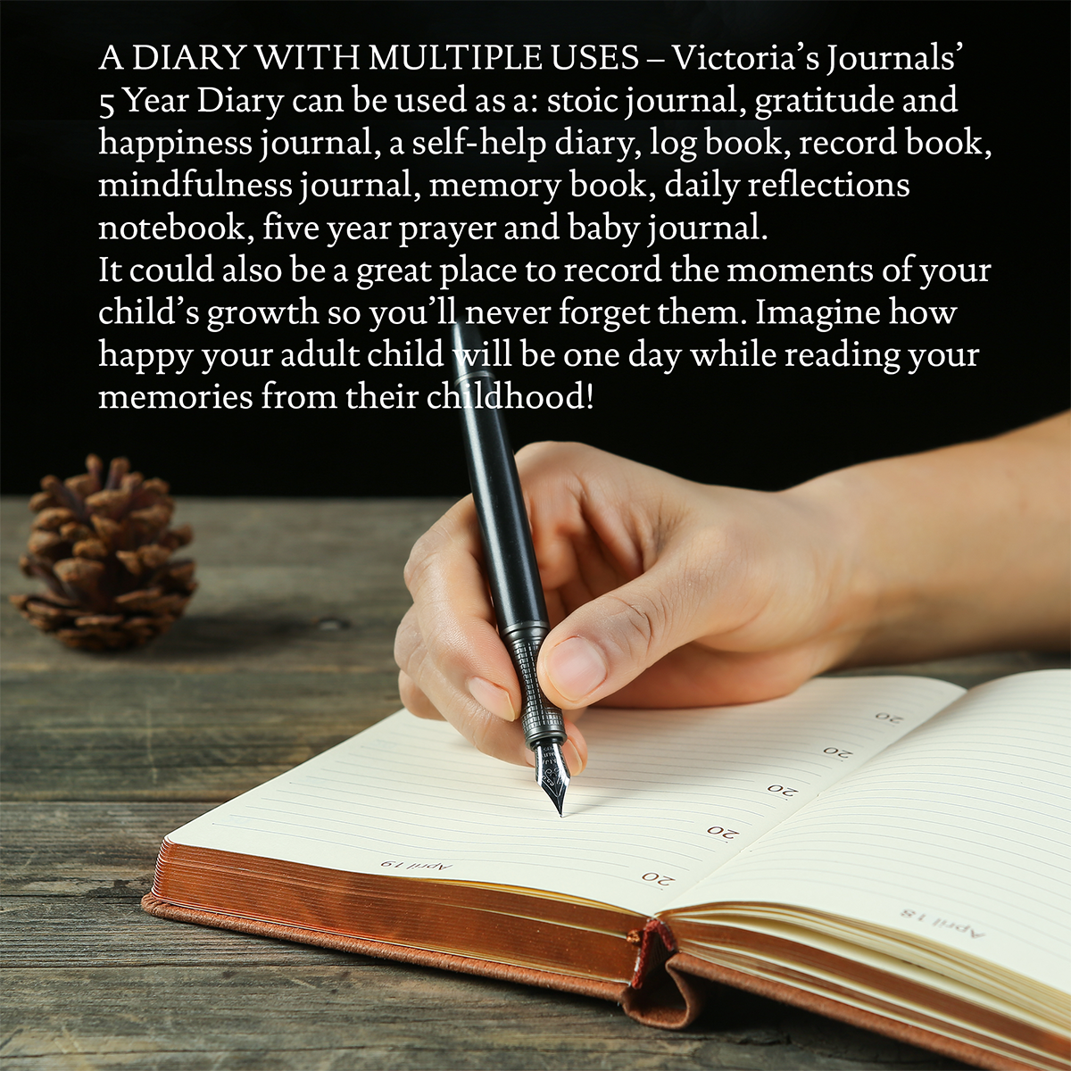- 👌 A DIARY WITH MULTIPLE USES – Victoria’s Journals 5 Year Diary can be used as a: stoic journal, gratitude and happiness journal, a self-help diary, log book, record book, mindfulness journal, memory book, daily reflections notebook, five year prayer journal. It could also be a great place to record the moments of your child’s growth so you’ll never forget them. Imagine how happy your adult child will be one day while reading your memories from their childhood!
